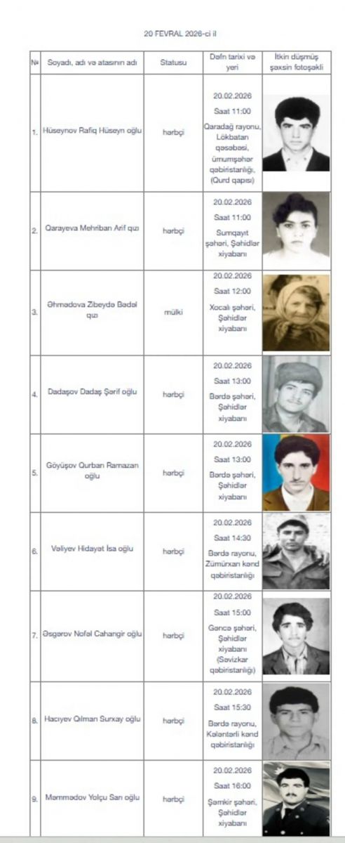 Daha 17 itkin-şəhid dəfn olunacaq - FOTO HADİSƏ 18 Fevral 2026 Oxunma sayı: 154 Daha 17 itkin-şəhid dəfn olunacaq. Sabahinfo.az xəbər verir ki, bu barədə Əsir və itkin düşmüş, girov götürülmüş vətəndaşlarla əlaqədar Dövlət Komissiyasının itkin-şəhidlərin dəfn mərasimlərinə dair məlumatında bildirilib.