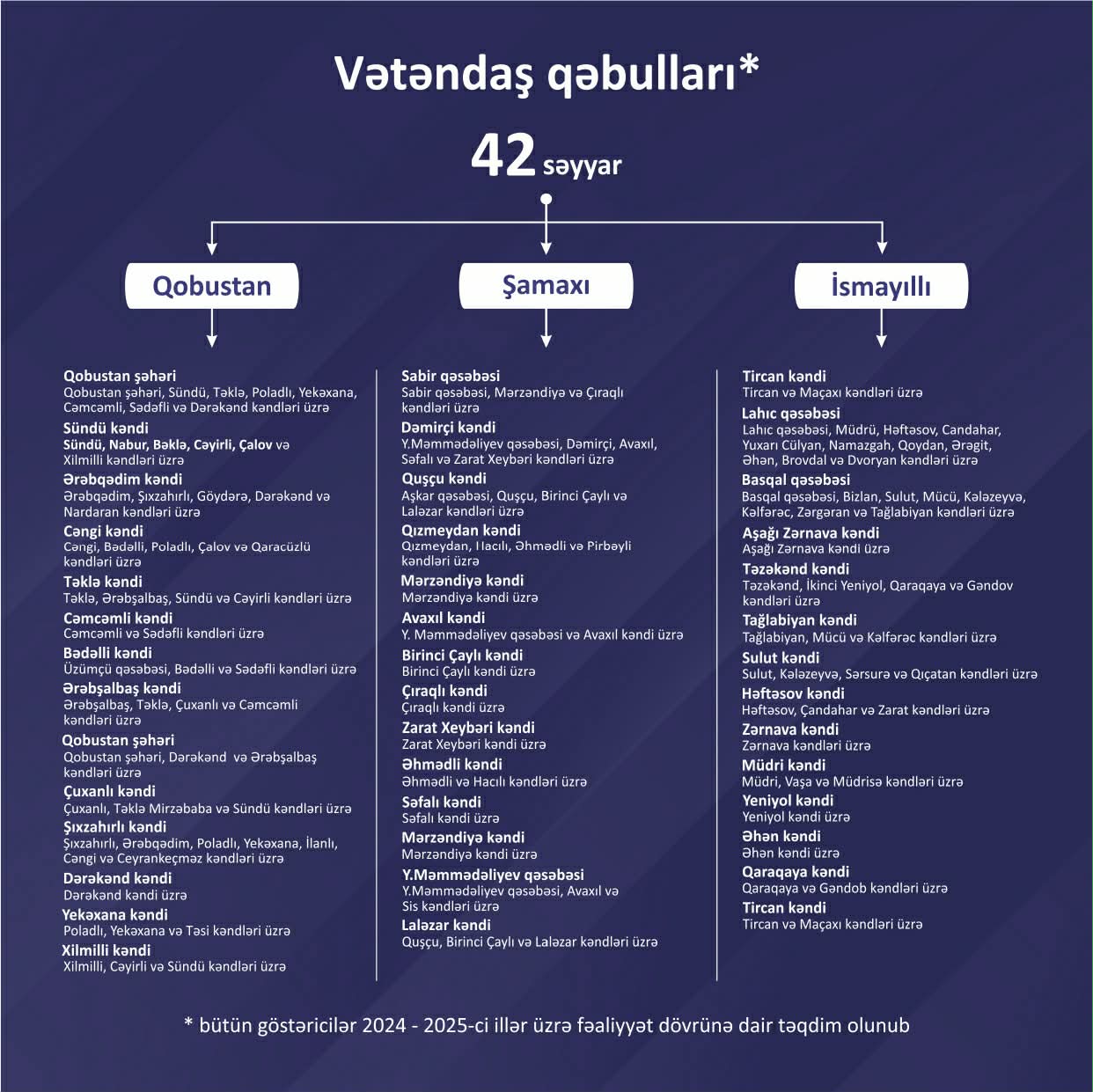 Fəaliyyət dövründə Qobustan, Şamaxı və İsmayıllı rayonlarında ümumilikdə 42 vətəndaş qəbulu keçirilib. Qəbullarda 1 şəhər, 6 qəsəbə və 59 kənddən 497 vətəndaş iştirak edib. Ümumi daxil olan müraciətlərin sayı - 806. Müraciətlər əsasən sosial məsələlər, məşğulluq, təhsil, infrastruktur və digər sahələri əhatə edib. Onların bir qismi yerində həll edilib, digərləri isə aidiyyəti üzrə müvafiq dövlət qurumlarına yönləndirilib.