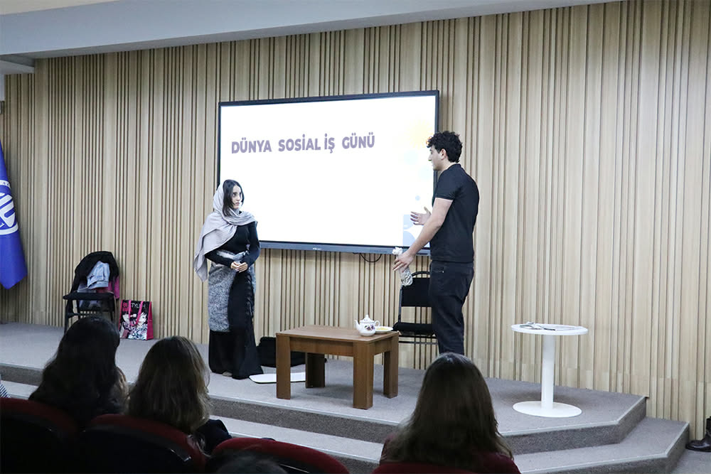 “Sossfera” klubunun təşkilatçılığı ilə keçirilən tədbir isə sosial iş ixtisası üzrə təhsil alan tələbələrin hazırladığı sosial keysin səhnələşdirilməsi ilə başlayıb. Səhnə vasitəsilə cəmiyyətdə mövcud olan sosial problemlər, həssas qrupların qarşılaşdığı çətinliklər və sosial işçilərin bu prosesdəki rolu nümayiş etdirilib.