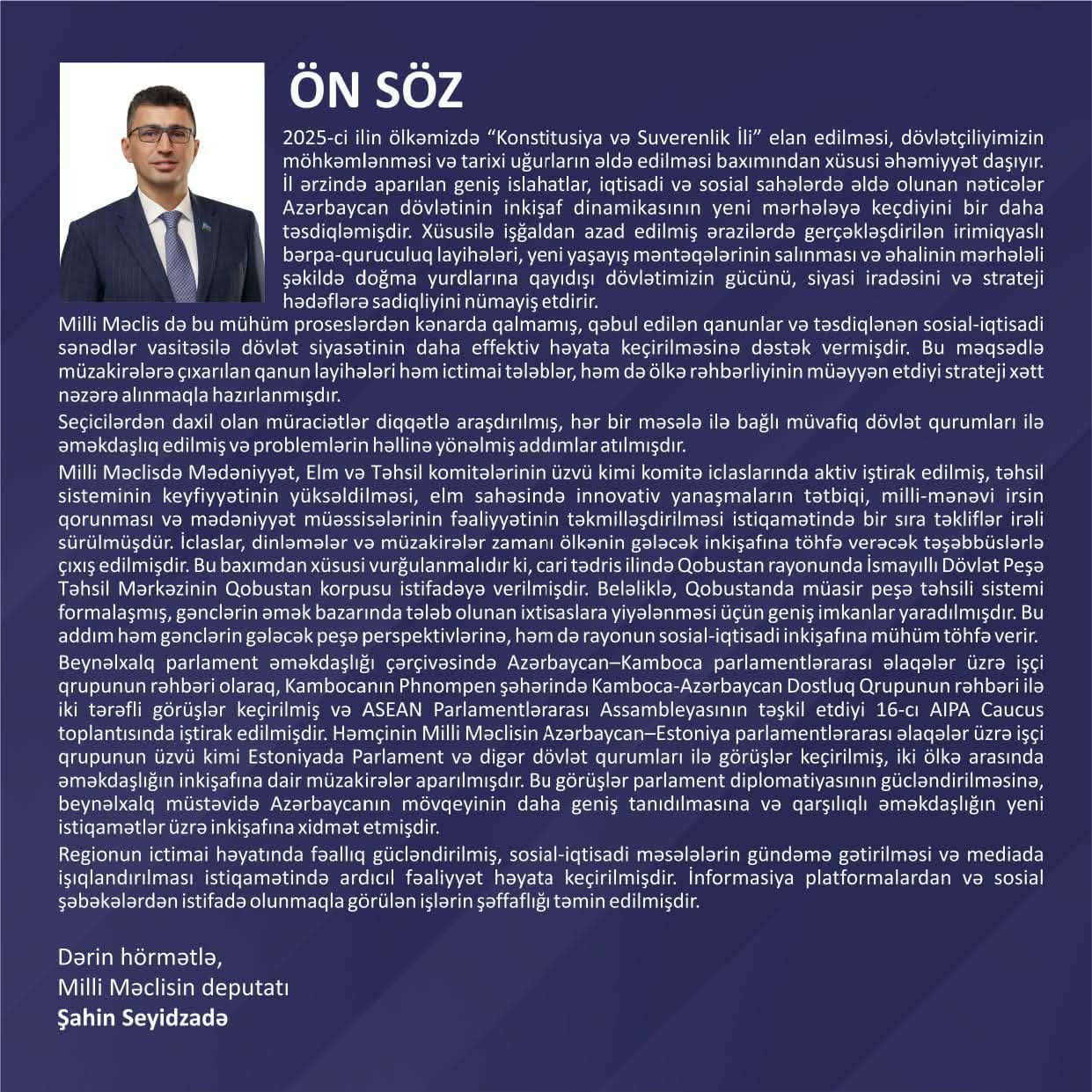 2025-ci ilin payız sessiyası dövründə parlament fəaliyyəti ilə yanaşı, vətəndaşlarla birbaşa ünsiyyətin təmin olunması və ictimaiyyətin mütəmadi məlumatlandırılması əsas prioritetlərdən biri olub.